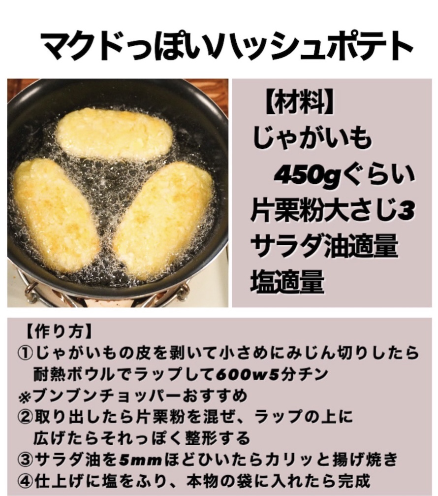 完成した姿はまさにマクドナルドのハッシュポテトそのもの。まるみキッチンさんも「もうマクドいかんでええやん」と自信を覗かせています。ただしここまで再現する際の問題は、包装紙を取っておかなくてはならないことでしょうか。