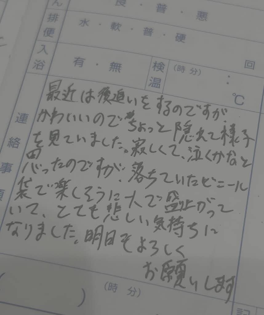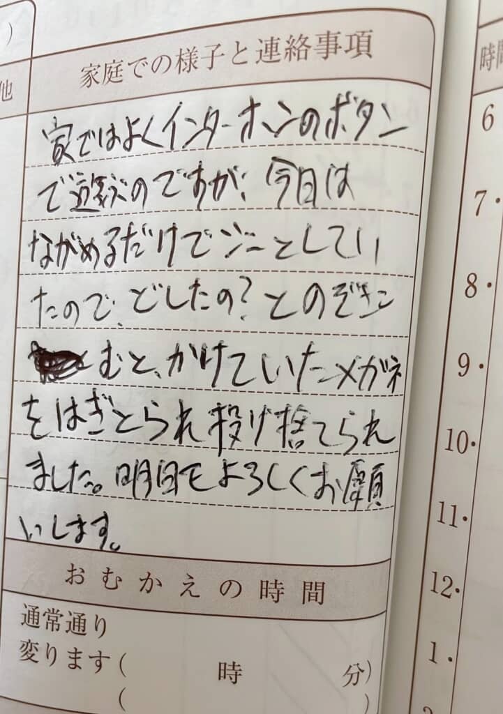 やはり息子さんによるバイオレンスを行動を淡々と伝えた上で、「明日もよろしくお願いします」と伝えたのでした。「痛かったです」のようなパパの感情を書かずに、ただただ息子さんの状況だけを伝えているので、連絡帳としては正しいのかもしれないけど”オチ”が唐突すぎる!