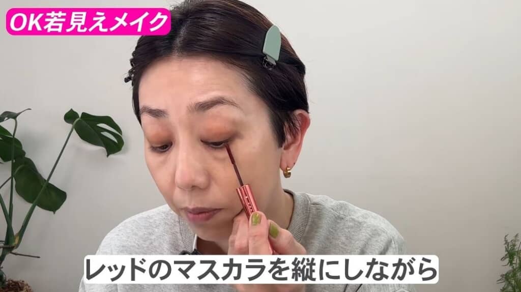 アイメイクでは、まず目元用下地を使用して発色と持ちをアップ。アイシャドウはイエローブラウン系で自然な陰影を作り、ビューラーとマスカラでまつ毛をナチュラルに立ち上げます。目尻にはレッドのマスカラを少しだけ乗せ、さりげなく抜け感をプラスしました。