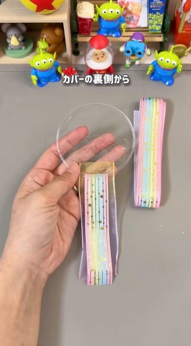 まずは、缶バッジカバーの裏側からシフォンリボンを垂らすように貼り付けます。次に、ベージュのフリルリボンをカバーの周りにぐるっと貼りました。この時点でもうかわいい……!