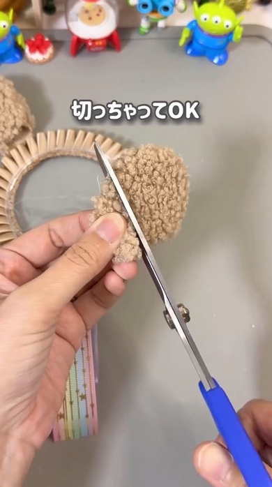 ゆっきーさんが作ったのは、ディズニーキャラクターをモチーフにしたロゼットです。ベースとして使用するのは、ダイソーで販売している直径約75ミリの缶バッチカバー。これに、手持ちのリボンやボア生地を貼り付けて仕上げます。