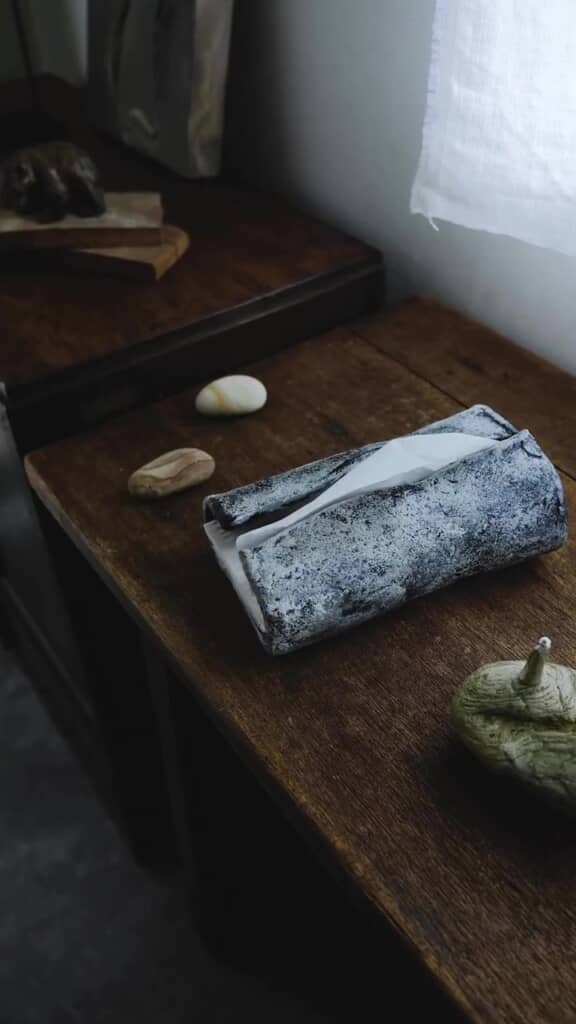 適当なティッシュに沿うように丸めたら、真ん中の辺りにナイフを入れティッシュの取り出し口を作ります。さらにこの状態で粘土を固めて、最後にブラックで塗装。最後にスポンジでトントンと色をなじませます。すると穏やかな和室によくマッチしそうな、古風な雰囲気のするティッシュカバーが完成しました。もちろん使い勝手もバッチリ。ティッシュを引っ張れば、束にならずスルスルと次々取れていきます。