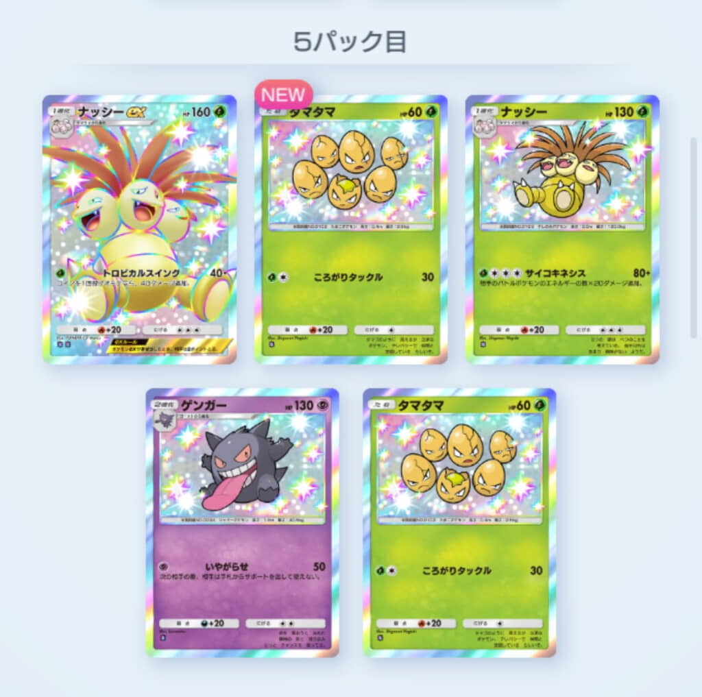普通なら思わず「やったー」と声を出したくなるような“引き”ですが、ふみゅさんの“初ゴッドパック”の開封結果は「タマタマ」2枚、タマタマの進化形である「ナッシー」2枚、残りが「ゲンガー」というかぶりまくりの内容です。Oh……!