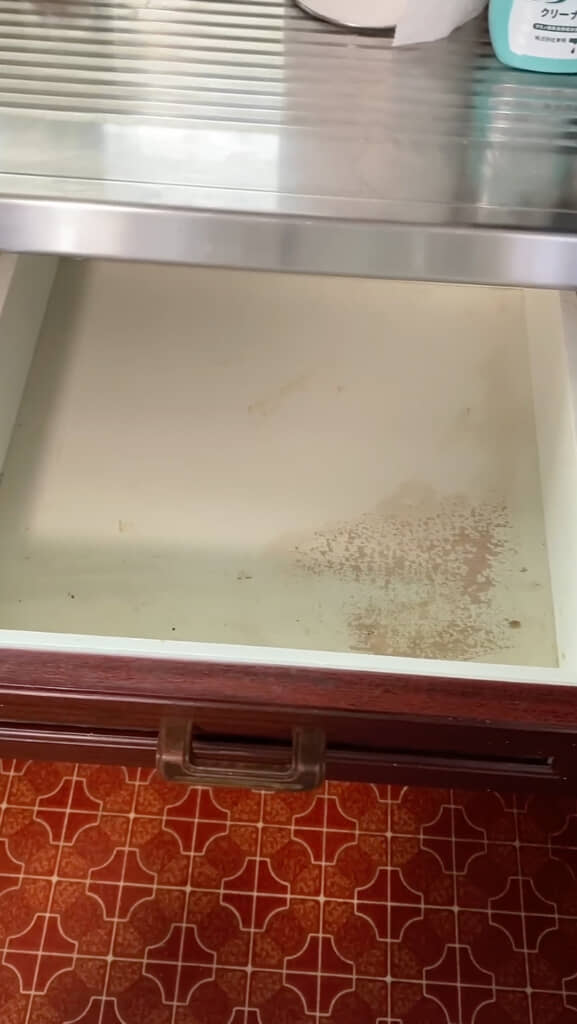 無事仕分けが終わり、次は引き出しの中の掃除を開始。掃除機で大きなゴミを吸ってから、ウタマロクリーナーで拭いていきます。多少塗装が剥がれていましたが、こびりついた油汚れも落ちだいぶキレイになりました。