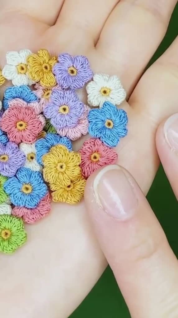 そうして編まれたのは、指先にちょこんとのるくらい小さくて色とりどりの花たち。これだけでも十分かわいい仕上がりですが、ここからさらに手を加えていきます。