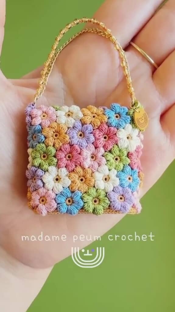 編んだ花を一つ一つつなぎ合わせて、完成したのは……? なんと、とっても愛らしく繊細なミニチュアバッグでした! 単体でもキュートだった花たちが、バッグという“完成形”になることで、さらに魅力が倍増したように見えます。