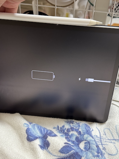 投稿者はXユーザーの「味」(@kuta___key)さん。味さんのiPadはバッテリー残量がなくなり、充電切れを示す画面が表示されてしまいました。