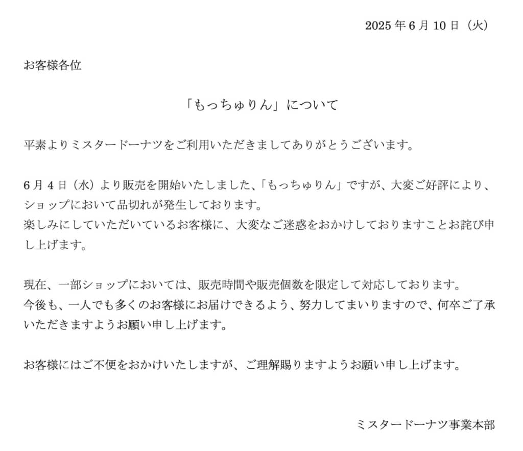 新ドーナツは各地で品切れが続出しており、ミスドは10日に公式サイトへ謝罪文を掲載。一部店舗では販売時間や販売個数を限定しているとし、「今後も、一人でも多くのお客様にお届けできるよう、努力してまいりますので、何卒ご了承いただきますようお願い申し上げます」とコメントしました(関連記事)。