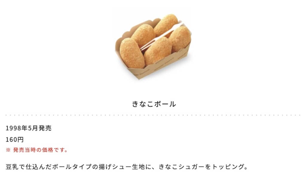 そんな早くも人気を集めているドーナツのきなこ味に対し、一部で上がっているのが1998年5月発売の「きなこボール」を思い出したという声です。きなこボールは、豆乳で仕込んだボールタイプの揚げシュー生地に、きなこシュガーをトッピングしたもの。すでに販売終了しているものの、多くのファンを抱えています。