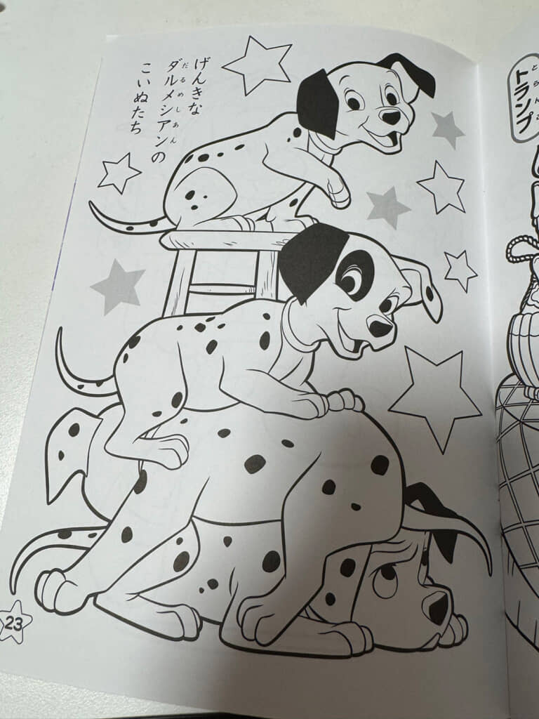 ダルメシアンは、耳や鼻なども着色済で塗れそうな部分はありません。残された楽しみ方は、ダルメシアン以外を塗るか毛色を塗り替えるか……? 大人にとっては発想力が試される塗り絵です。