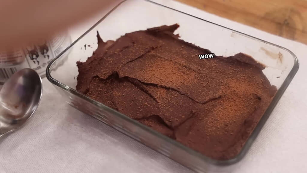 しっかり固まるのを待つこと数時間。最後にココアパウダーを散らしたら完成です。冷やしたり焼いたりしていませんが、簡単にスプーンが入らないほどの弾力を見せます。