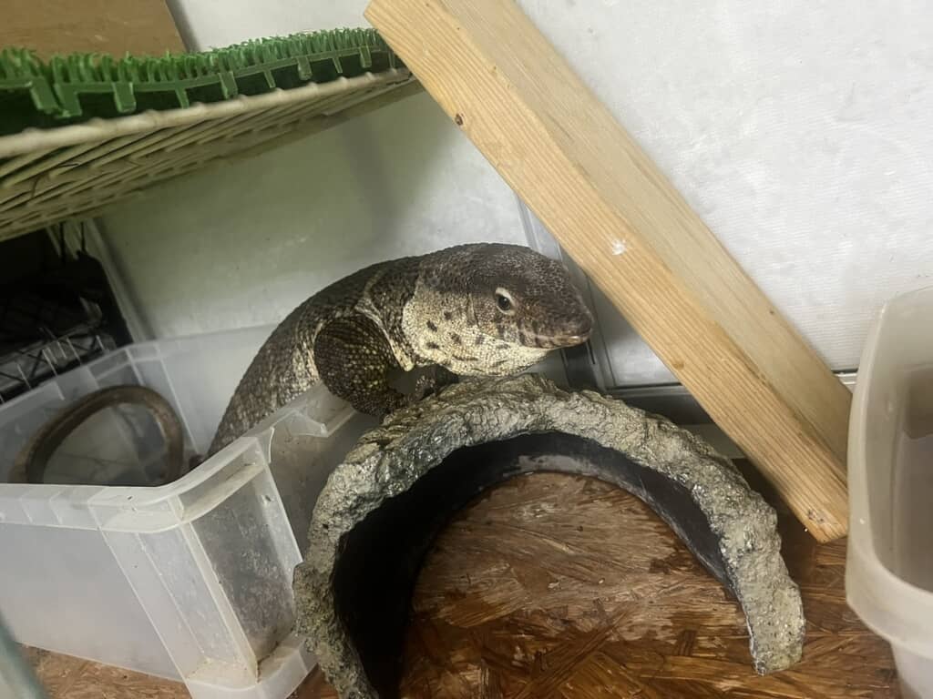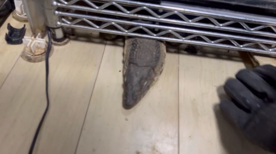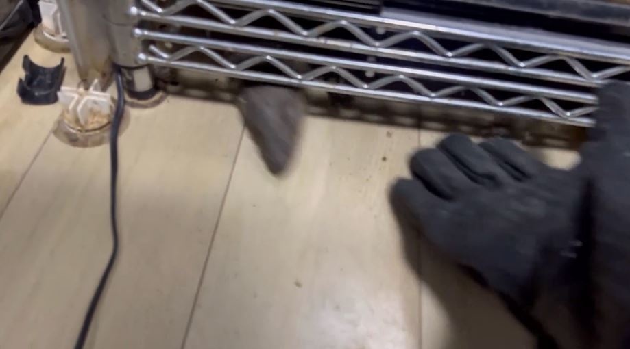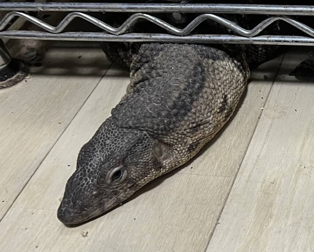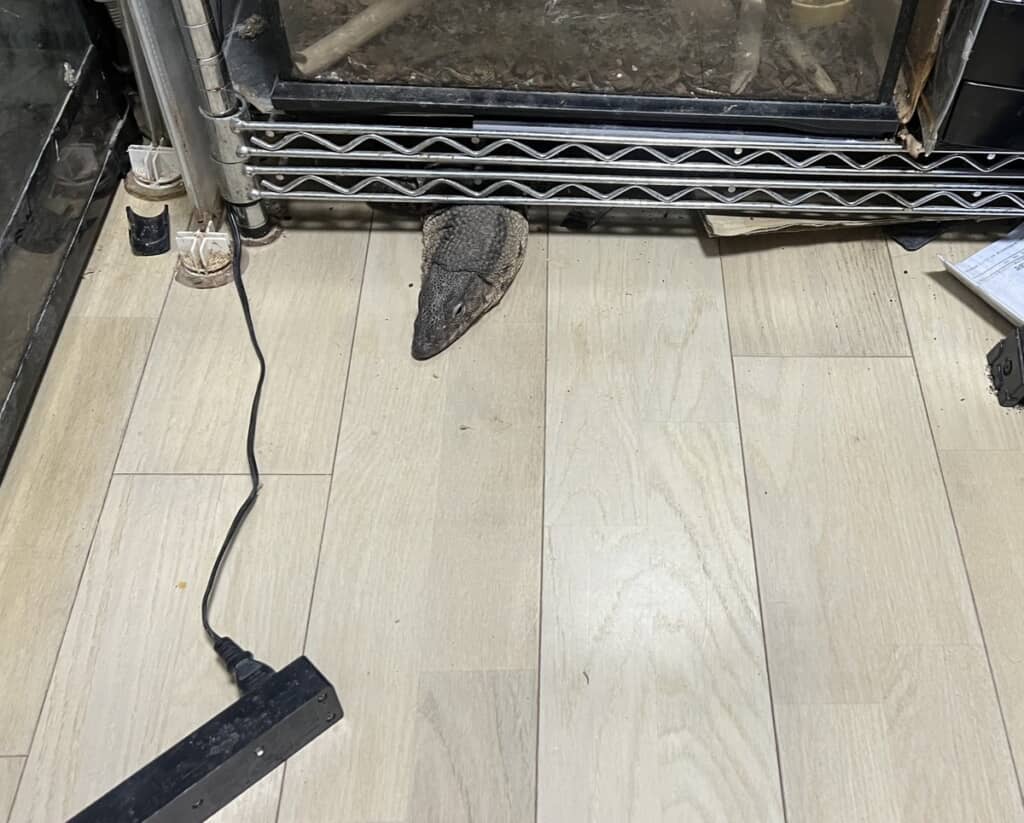 しかし、手を伸ばした瞬間……トカゲは機敏な動きでメタルラックの下に引っ込んでしまいました。素早い……! トギさんによると、トカゲはこの調子で捕まえられそうになったらクビを引っ込めて奥に逃げてしまったそうで、メタルラックの下から顔だけ出してくつろいでいたそうです。リアルワニワニパニックだ。
