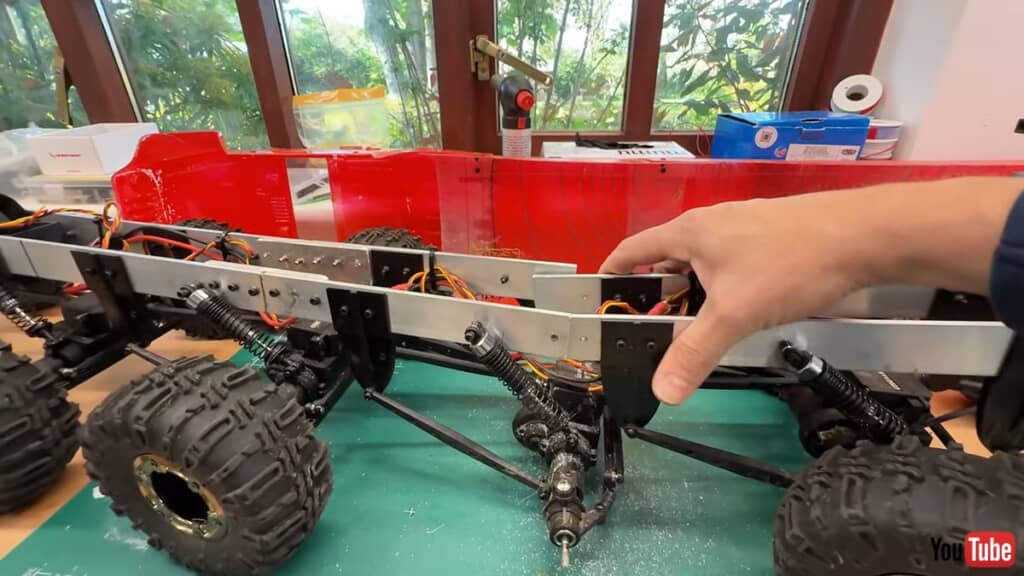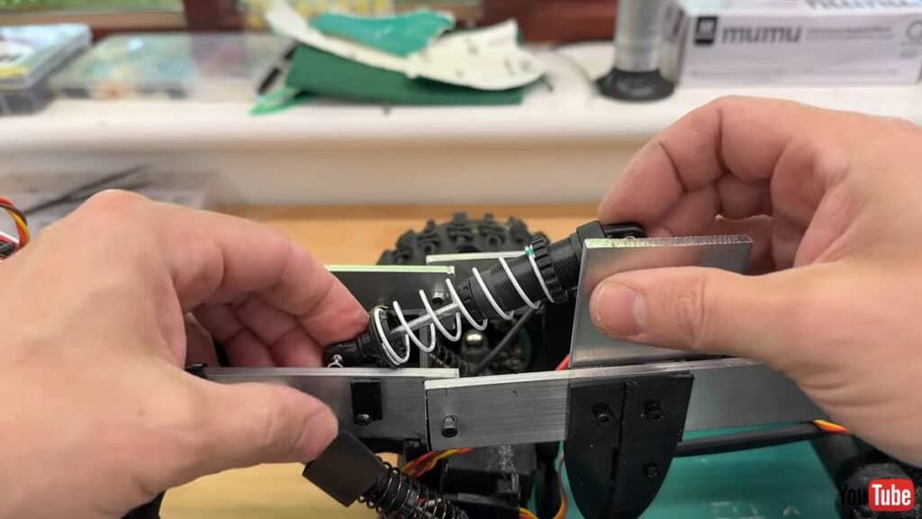 今回の動画では、新たに2つのヒンジ部を車体に取り付けました。ヒンジ部を増設して、さらなる走破性の向上を狙いますが、あまりにヒンジ部が多すぎるとタイヤが宙に浮いてしまい、タイヤが空転してしまって走れなくなるといいます。