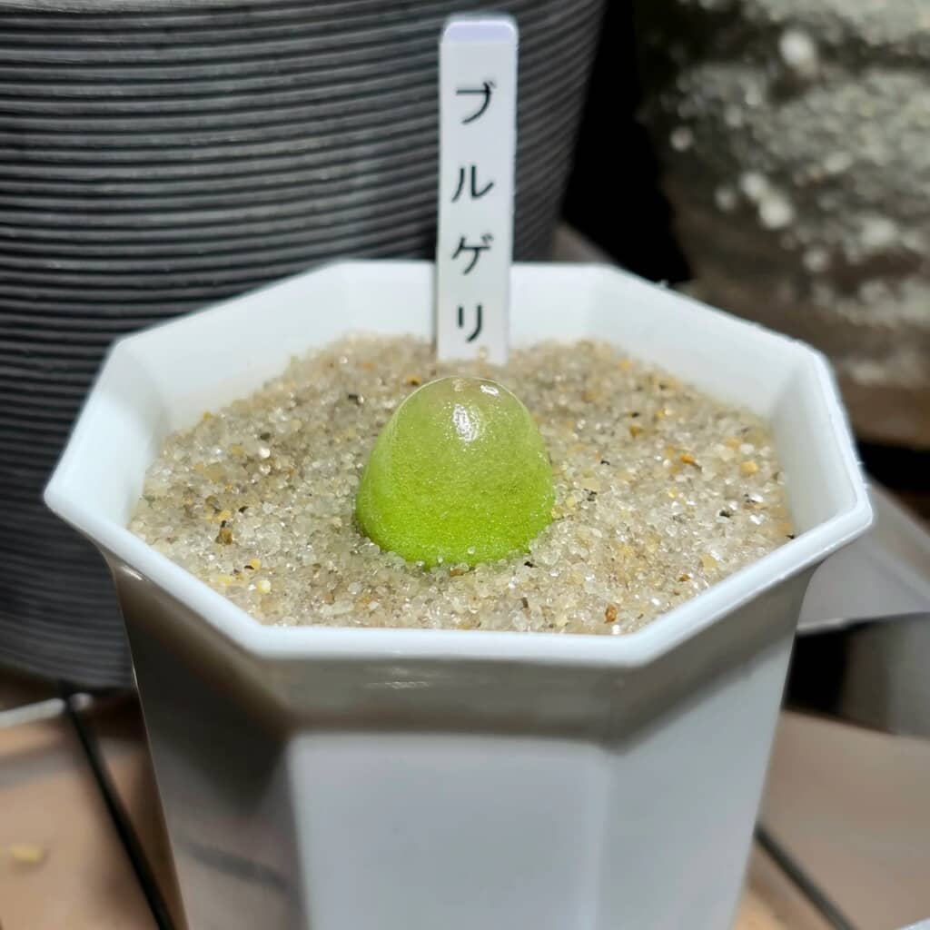 これは、コノフィツム・ブルゲリという多肉植物の一種です。先端のある球体形をしており、薄皮に包まれた透明感のあるツヤやかな表皮が特徴的です。ゆみこさんが育てている植物たちと並ぶと、完全に異彩を放っています。