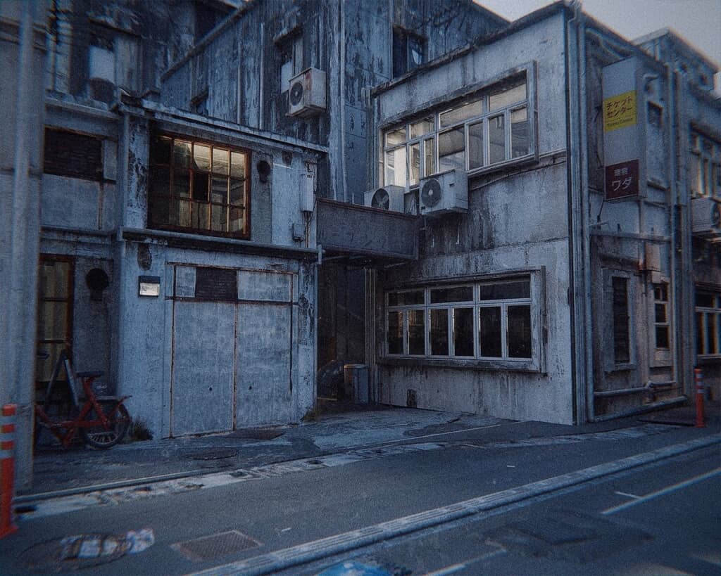 少し朽ちて汚れている壁の様子や備え付けられた室外機の雰囲気、古めかしい窓枠やその中から漏れている淡い光、増築に増築を重ねたかのような無秩序な構造などの要素が、見る人の心をくすぐります。センス抜群すぎる。