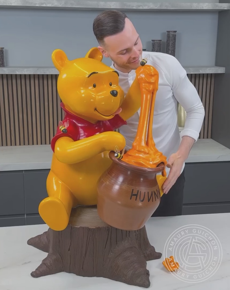 今回紹介するのは、ディズニーの人気キャラクター「くまのプーさん」をテーマにしたチョコレート彫刻です。キャラクター本体に加えて、はちみつがあふれるハニーポット、丸太のイス、3匹のミツバチといった小道具もすべてチョコレートで作ります。