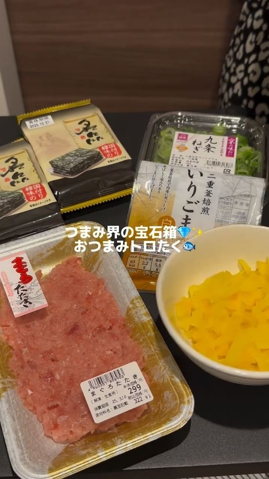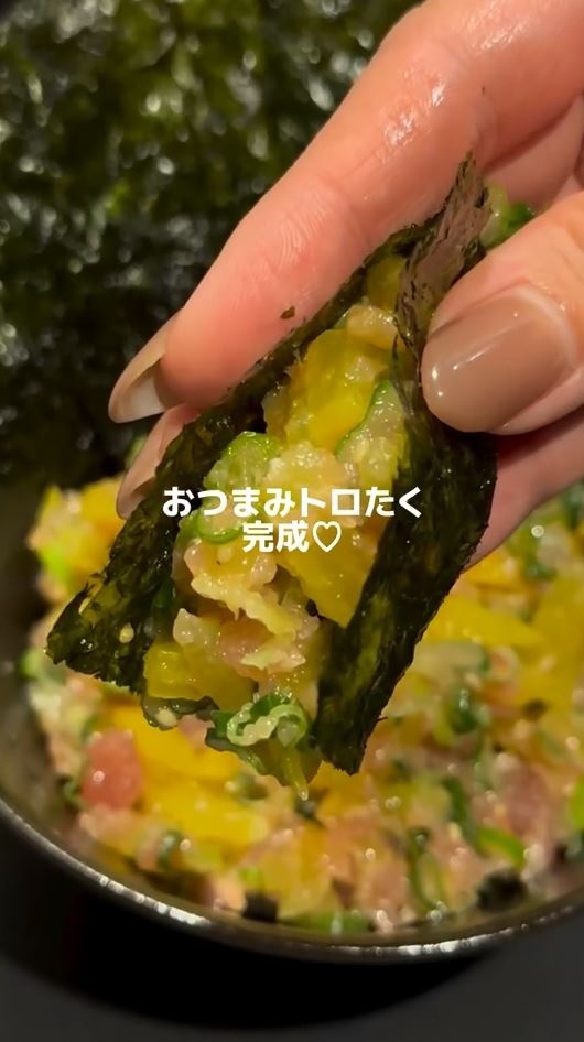 今回、ショウコさんが紹介したのは、“つまみ界の宝石箱”こと、「おつまみとろたく」です。用意するのは、まぐろたたき、細かく刻んだたくあん、いりごま、ねぎ、味付けのり、塩、にんにくチューブ、ごま油です。