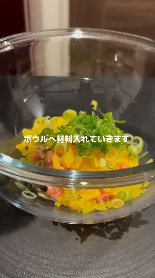 まずは、ボウルにまぐろのたたき、たくあん、ねぎを入れます。 そこにごま、塩、にんにくチューブを入れたら、ごま油を加えます。