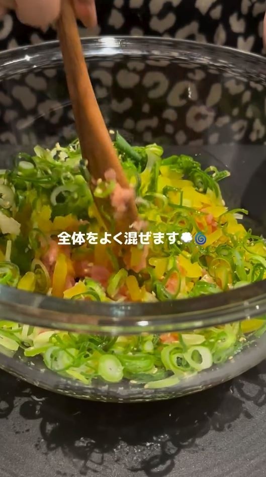 まぐろたたき、たくあん、ねぎを入れる