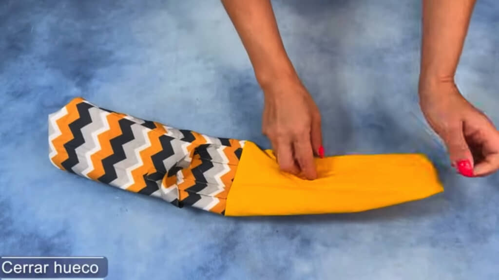 次はあらかじめ作っておいた留め具用のリボンを本体の表地に縫い付けた状態で袋状に縫い合わせていく工程。次に、同じように袋状に縫った黄色の裏地を表地と縫い合わせ、筒状に形を整えていきます。ここまでくれば、完成までもう一息です。