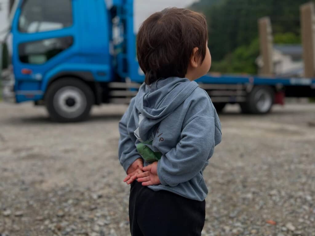 続く写真は、トレーラーの前に立って前を見つめている姿です。まるで工事の現場監督のような雰囲気を漂わせていて、小さな子どもなのに数々の困難を乗り越えてきた職人のようにも見えます。これは将来大物になりそう……!
