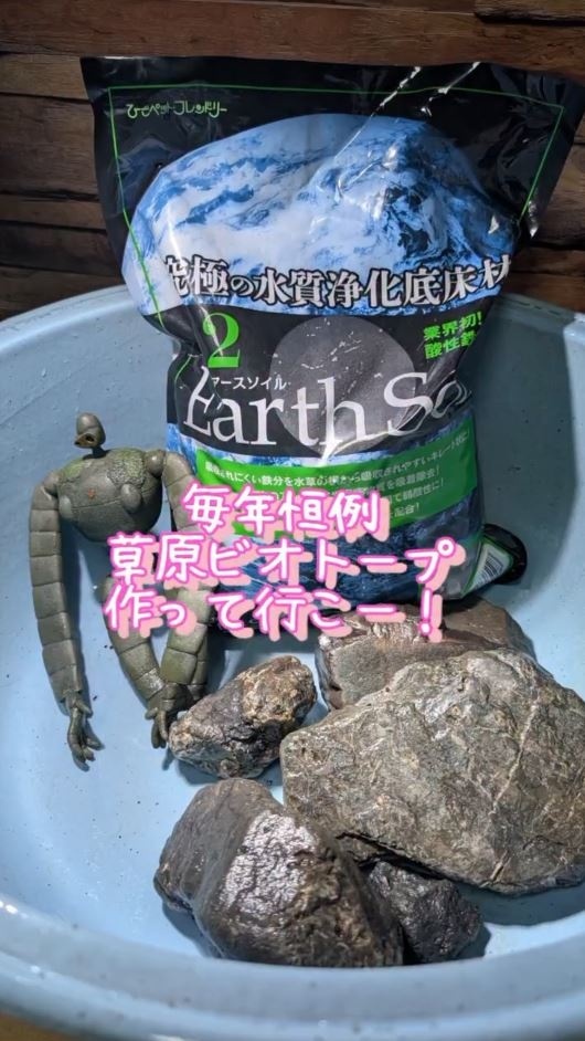 投稿したのは、メダカや亀、2匹の愛犬をはじめ、たくさんの生き物たちと暮らしている「aki」(@akr_6.9)さん。今回は毎年恒例となっている“草原ビオトープ”をつくる様子を公開しました。