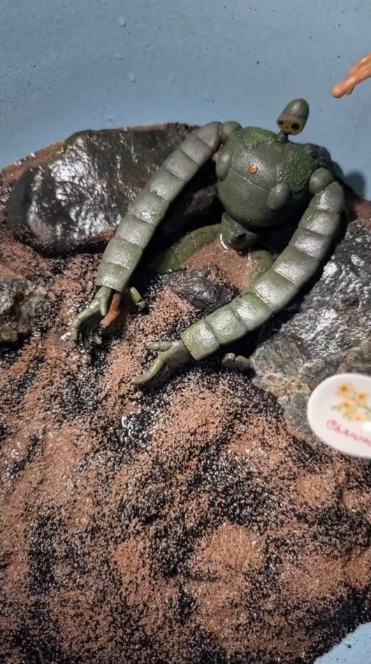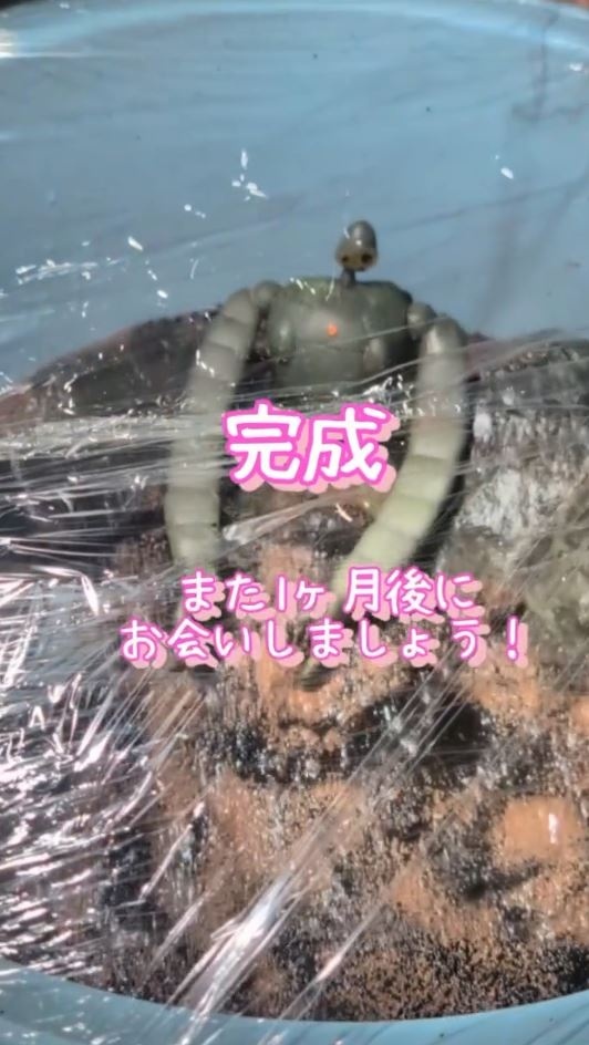 まず大きめの鉢にソイルを敷き、そこにゴツゴツとした石とジブリ映画「天空の城ラピュタ」に登場するロボット兵を配置します。霧吹きでソイルを湿らしたら、“謎の種”ことベビーハイグロシードを用意。スプーンを使ってまいていきます。