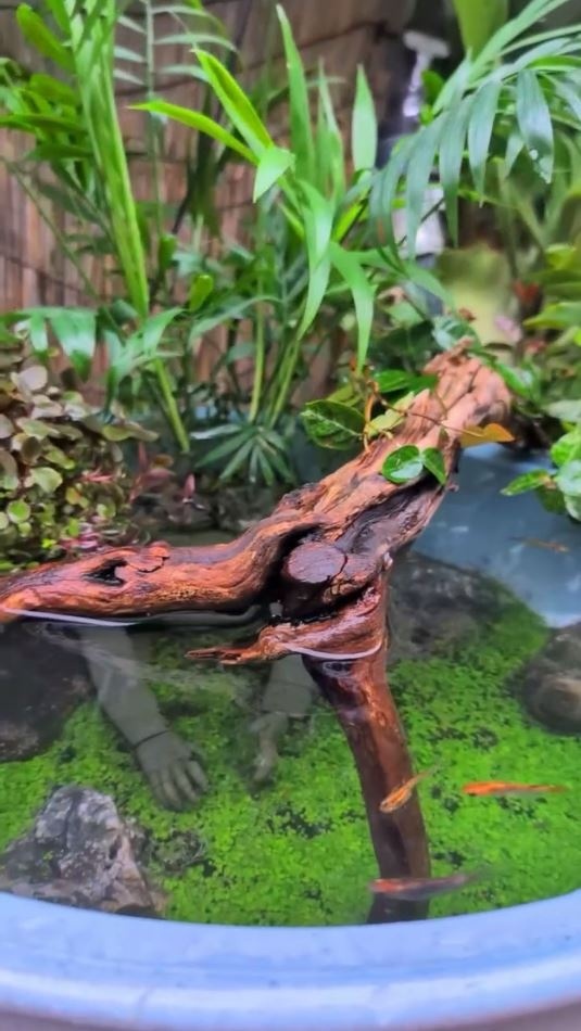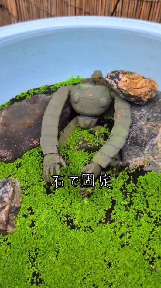 流木を中央部に設置し、最後にメダカを入れたら……とってもすてきなビオトープが完成! ベビーハイグロシードのあざざやかな緑の上で眠るロボット兵や、その周りを遊泳するメダカたち。さらに流木のインパクトも相まって、ずっと眺めていたくなるくらい美しい仕上がりとなりました。