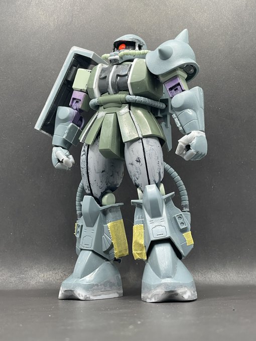 サイズが異なる3体のザクにはそれぞれ改造を施し、「黒い三連星」である3人の専用カラーに塗装。最も小さいカップガンプラを先頭のマッシュ機、中程度のサイズであるガシャプラを合図しているガイア機、1/144キットを手前のオルテガ機として配置しました。