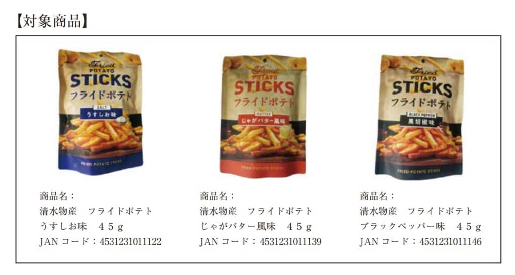 回収対象となるのは「清水物産 フライドポテト 45g」のうすしお味、じゃがバター風味、ブラックペッパー味の3商品。原産国は中国です。