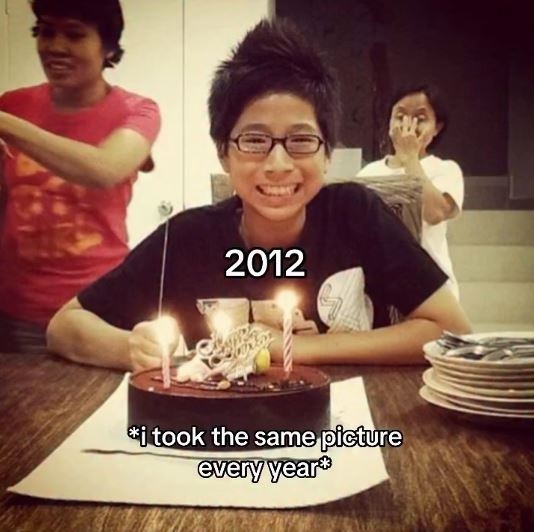 13歳から26歳になるまで、毎年誕生日に同じTシャツを着て、同じ場所で同じポーズをとっている写真を撮影したHongさん。バースデーケーキを目の前に、うれしそうな笑顔を見せています。