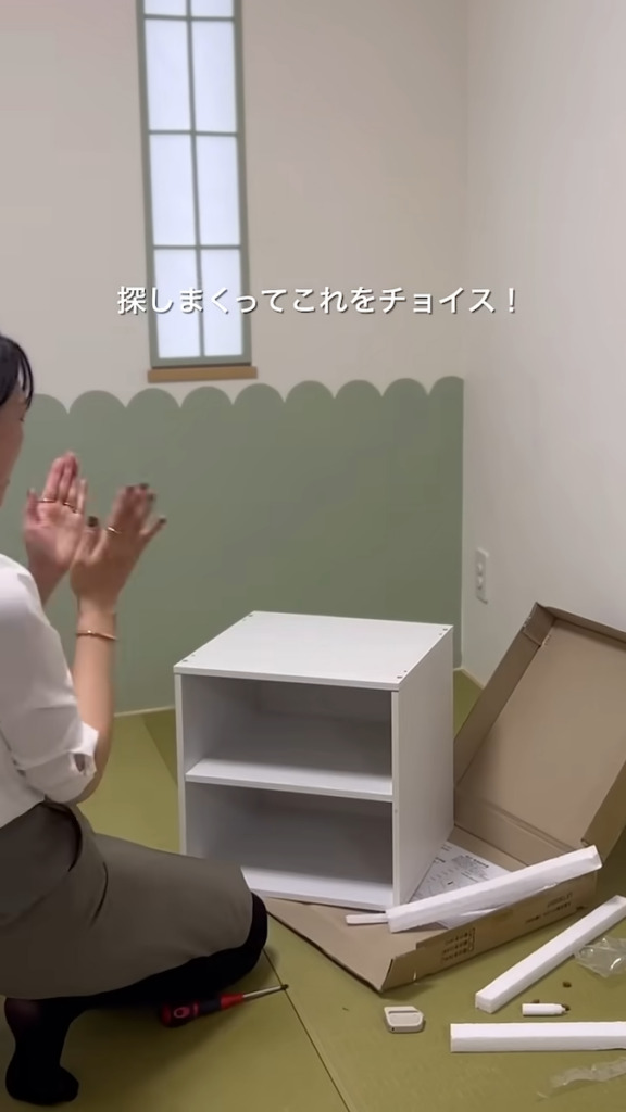 まず用意するのは、奥行35センチ×高さ35センチのキューブボックス。重ねて使える収納ボックスで、きなさんは2段に分かれた収納スペース付きの商品を選びました。