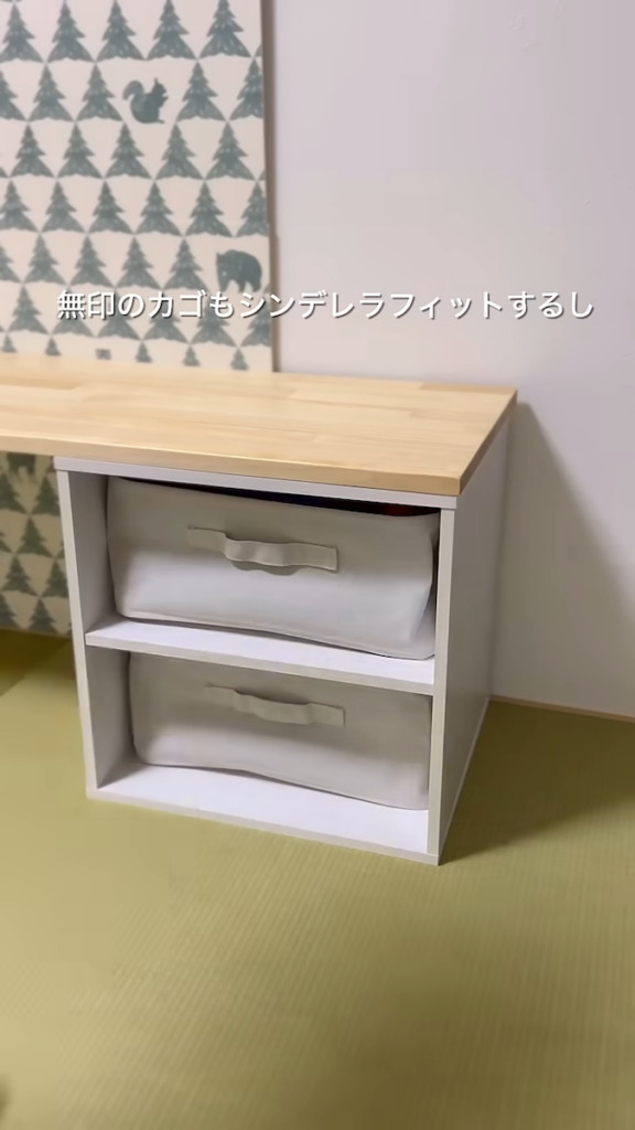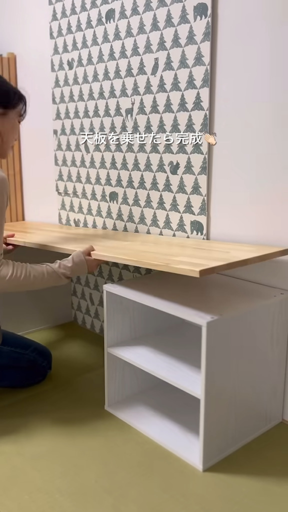 最後に、ボックス天面の四隅に透明の強力両面テープを貼り付け、加工した木板を乗せれば……ちょうどいい高さのキッズデスクが完成しました!