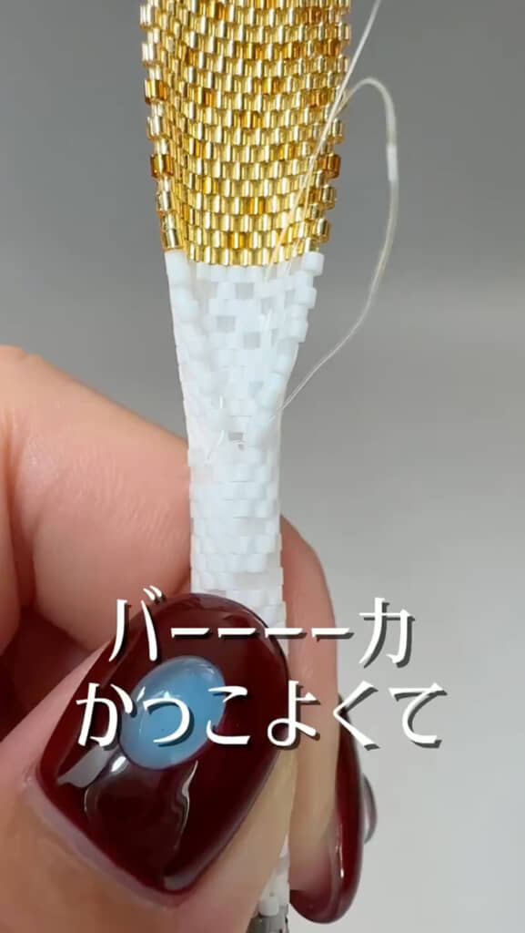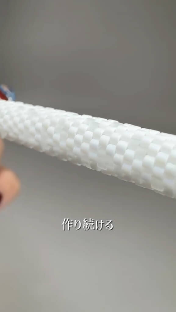 ビーズを編みながら、投稿者さんはあえてヘビしか作らない理由を「シンプルにバカかっこよくてバリ難しいから」「その圧倒的ポテンシャルがたまらんのですわ」と説明します。
