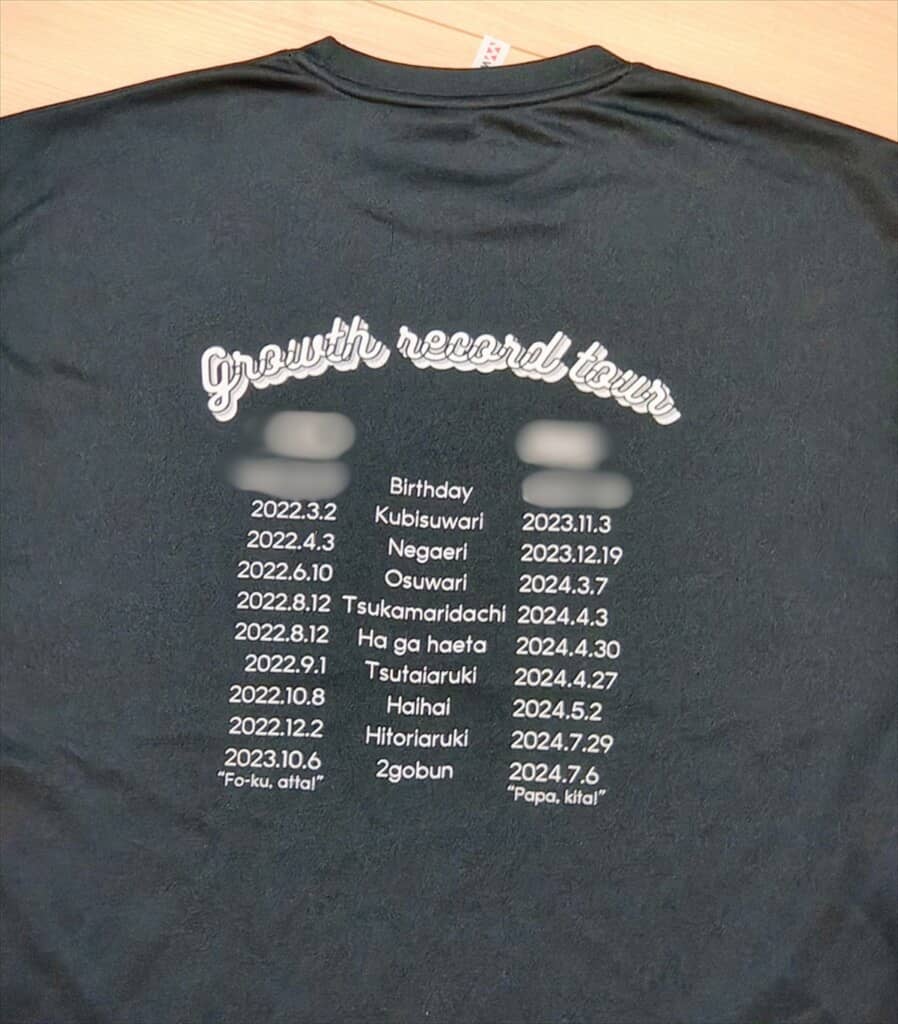 今回の投稿では、「見てーーーーーー!!! 子どもの“人生ツアーTシャツ”作った」と添えて、背面に「2022.3.2 Kubisuwari」「2022.4.3 Negaeri」「2022.6.10 Osuwari」など、“子どもの初めて”の記録を記したTシャツを紹介しています。