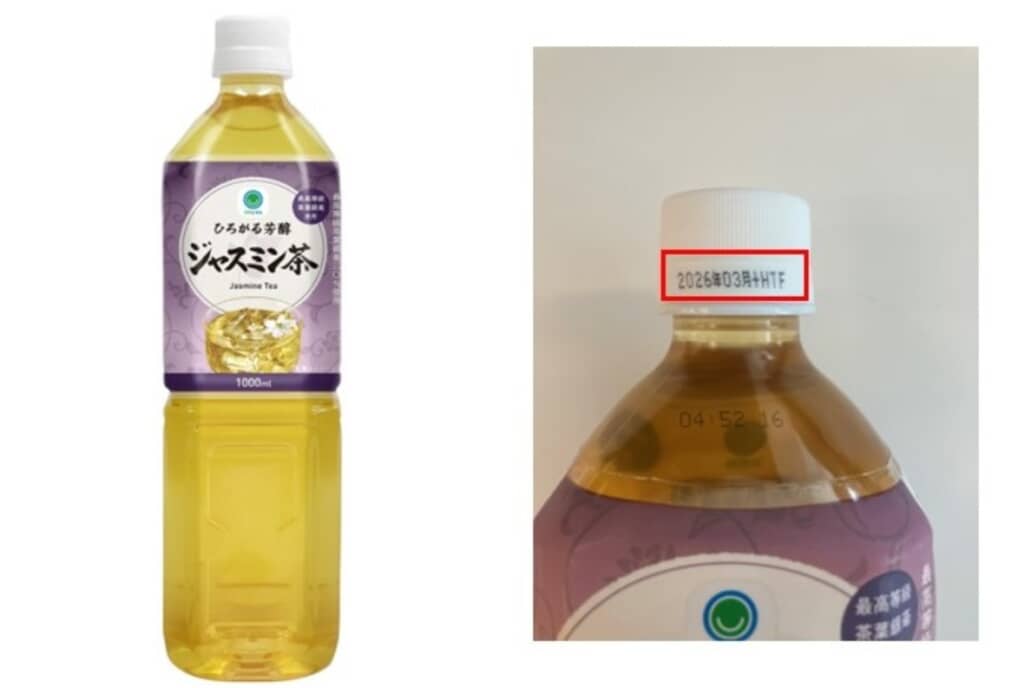 対象商品は「ひろがる芳醇 ジャスミン茶 1L」(160円)です。九州・沖縄地方を除く全国1万4499店舗で販売され、キャップに記載の賞味期限が「2026年03月まで」かつ、末尾の製造所固有記号が「+HTF」と記載されているものが対象。個数は最大227万1144本です。