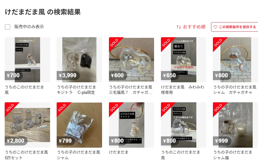 模倣品は主に、フリマサービスなどで「海外品」「類似品」「けだまだま風」などとうたって販売されており、「正規品はカプセルトイ自販機でのみ販売しており、フリマサイトなどで出品されている商品は、模倣品や非正規ルート品である可能性が高く、思わぬトラブルの原因となる場合がございます。お客様におかれましては、こうした商品をご購入されませんよう、十分にご注意いただきますようお願い申し上げます」と注意喚起しています。