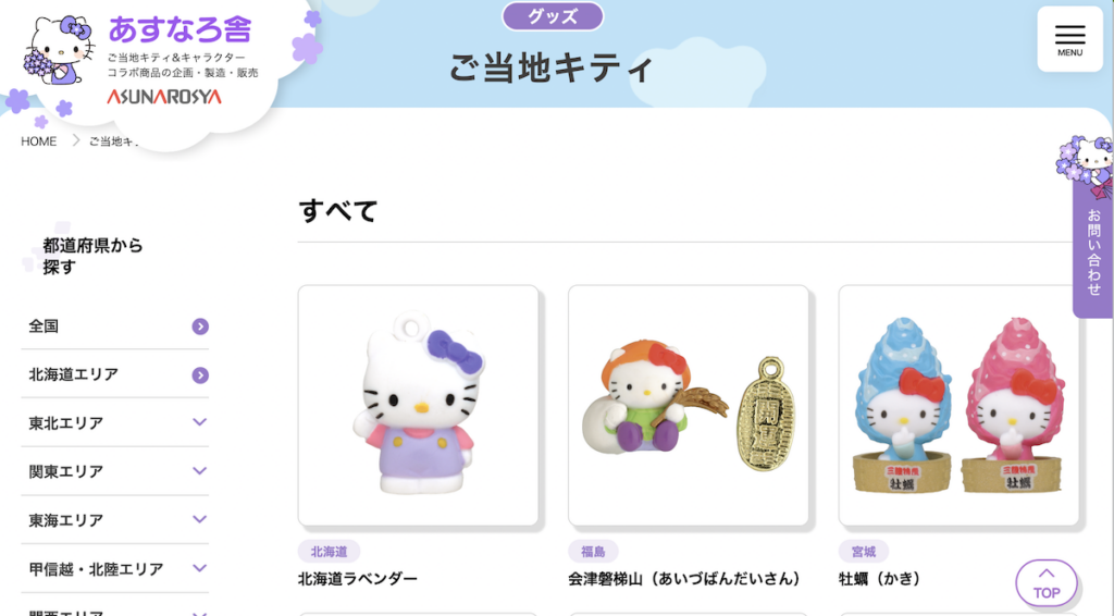 あすなろ舎のサイトでは歴代のご当地キティを見ることができます(画像はあすなろ舎HPから引用)