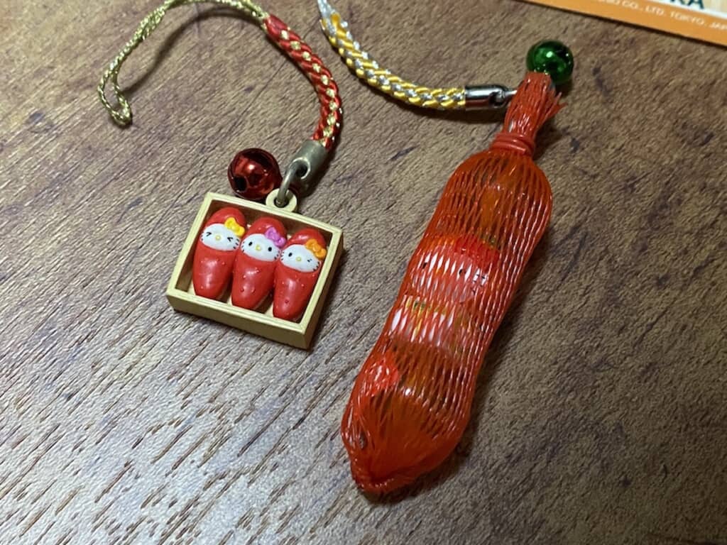 ハンカチ以外にも、ご当地の名産・名物に扮したハローキティの根付もユニークです。たとえば博多限定の根付は明太子になっちゃってますし、静岡限定の根付はみかんになった上にネットに包まれちゃっています(めちゃくちゃ手間かかってる)。