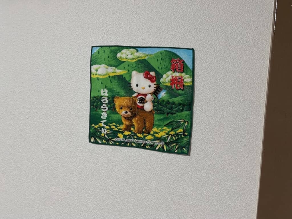 私が特にハンカチを好むのは、部屋に飾ったりして楽しめるからです。これは箱根限定の金太郎ハローキティですが、キティちゃんが熊を従えており何とも言えない迫力がある。かわいさとワイルドさを兼ね備えており、ちょっと笑ってしまいます。額か何かに入れたいな。