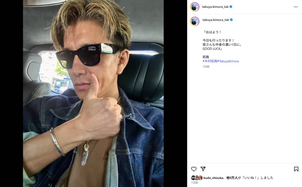 現場へ向かう車内でシルバーリングを着けた右腕を威勢よくサムズアップし、目立つ形でセットされた金髪姿で、「おはよう! 今日も行ったります! 皆さんも中身の濃い1日に」とつづり、投稿の定番となっている決め言葉“GOOD LUCK”で気合十分に締めています。
