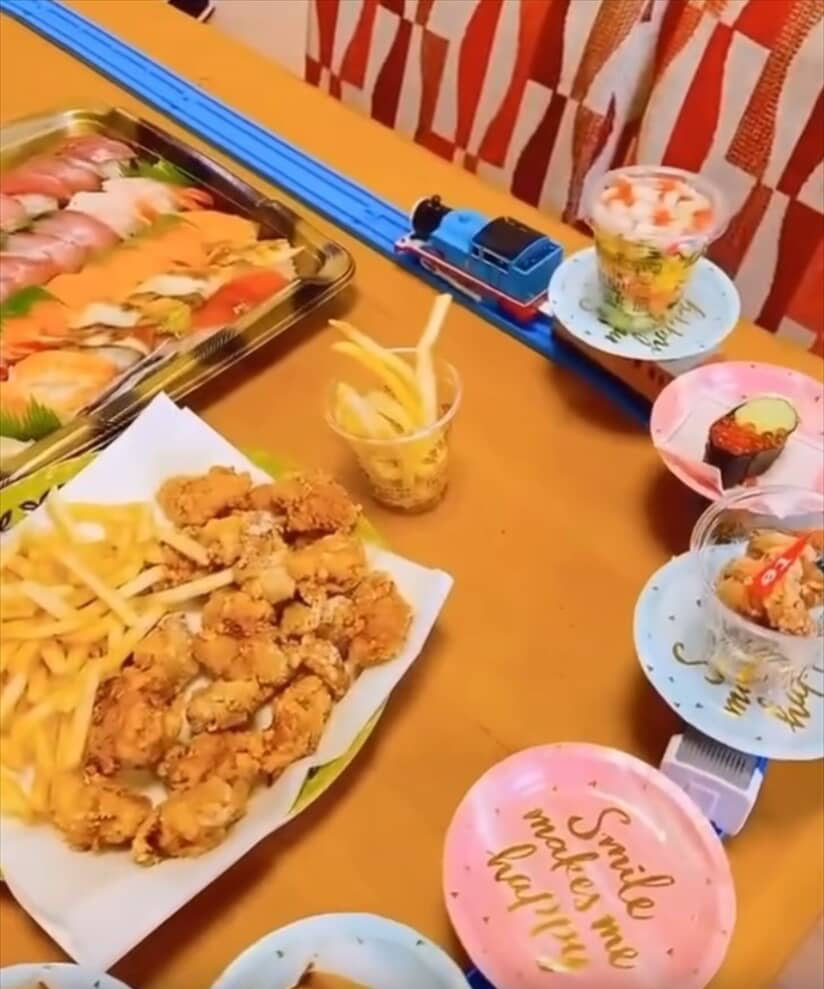 食卓にはバースデーケーキや唐揚げ、お寿司など豪華メニューがズラリ。その周囲を、お寿司やポテトの入ったカップを乗せたプラレールがグルグル回っており、まるで回転寿司のようになっているのです。とっても楽しそう!