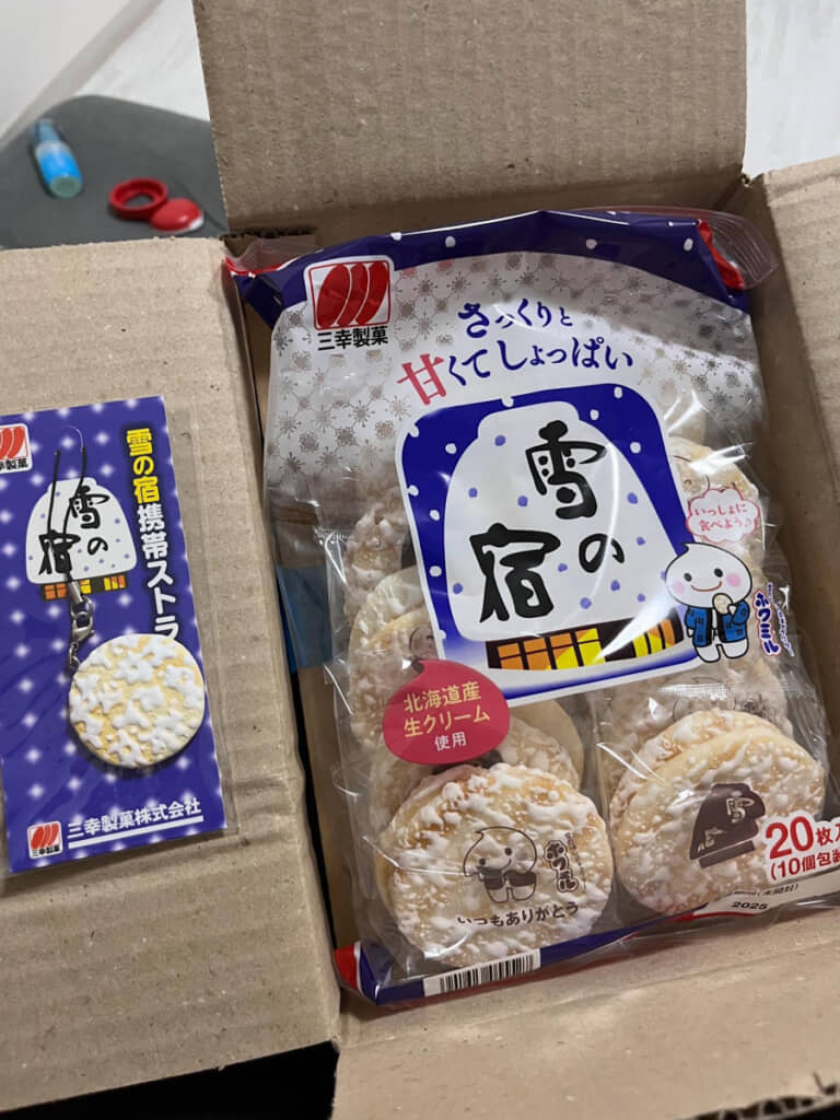 段ボールの中には、三幸製菓の米菓「雪の宿」20個入り1袋と、その中身にそっくりな見た目の「雪の宿携帯ストラップ」が入っています。