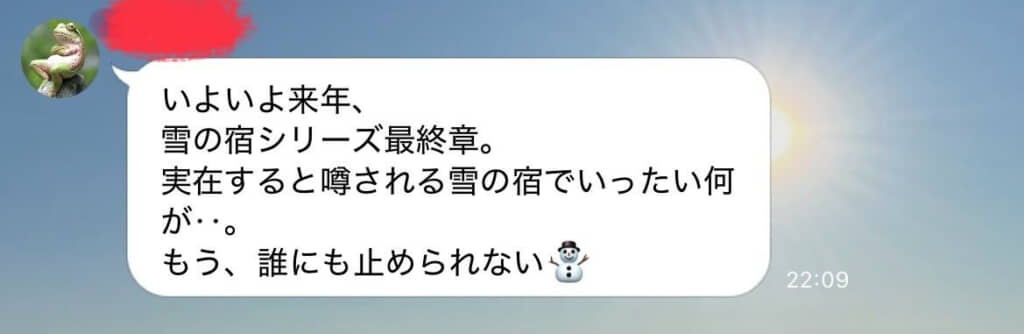 さらに、父からは「いよいよ来年、雪の宿シリーズ最終章。実在するとうわさされる雪の宿でいったい何が……。もう、誰にも止められない」というメッセージが届いたようです。ミステリー小説の帯に書かれていそうな、なんとも謎めいた文章。どういうことなんだ……。