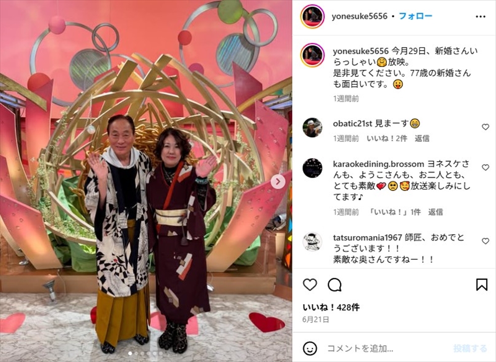 「突撃!隣の晩ごはん」で知られるタレントのヨネスケさん(落語家・桂米助さん)が、6月29日放送の長寿番組「新婚さんいらっしゃい!」(テレビ朝日系)に出演。“77歳の新婚さん”として、20歳年下の妻・陽子さんと登場しました。