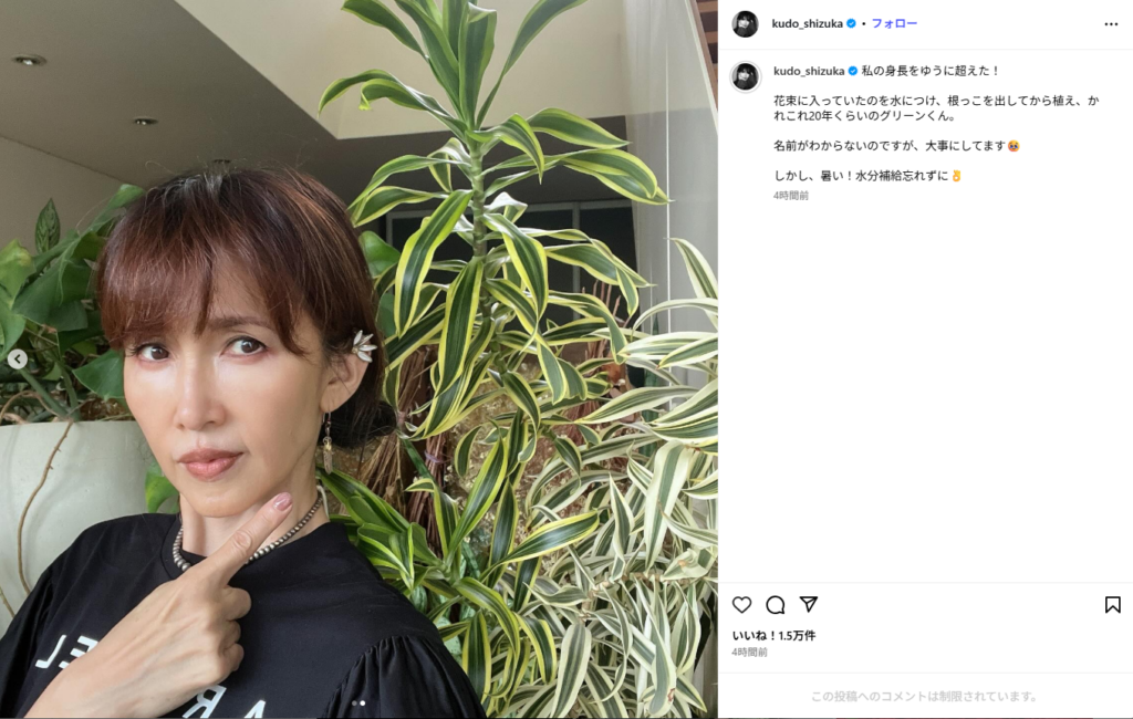 自宅と見られる室内でのショットを投稿した工藤さん。投稿文には「私の身長をゆうに超えた! 花束に入っていたのを水につけ、根っこを出してから植え、かれこれ20年くらいのグリーンくん。名前がわからないのですが、大事にしてます」と添えて、立派に育ったグリーンと工藤さんが並ぶ姿を公開しました。