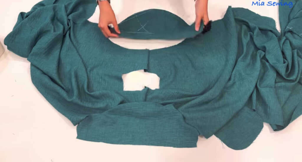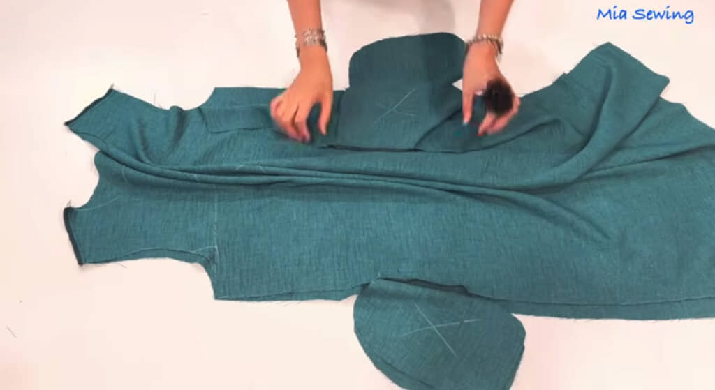 ここから一気にミシン掛けに入るのかと思いきや、ミアさんはまず、前身頃と後身頃を合わせて肩の部分とポケットの部分だけ縫い合わせます。