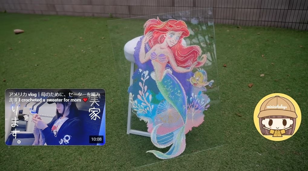この、アリエルが浮かび上がる透明感あふれるダイヤモンドアート作品には「わ~! 凄いアイデア! こうすれば下絵無しでダイヤモンドアートだけが綺麗に浮かび上がるわけですね! 素敵」という声や、「なんて美しい作品でしょう! とても可愛いですね!」「わー素敵な作品!!!! ガラスだから自然が透けてとってもいい!!」という声が寄せられていました。