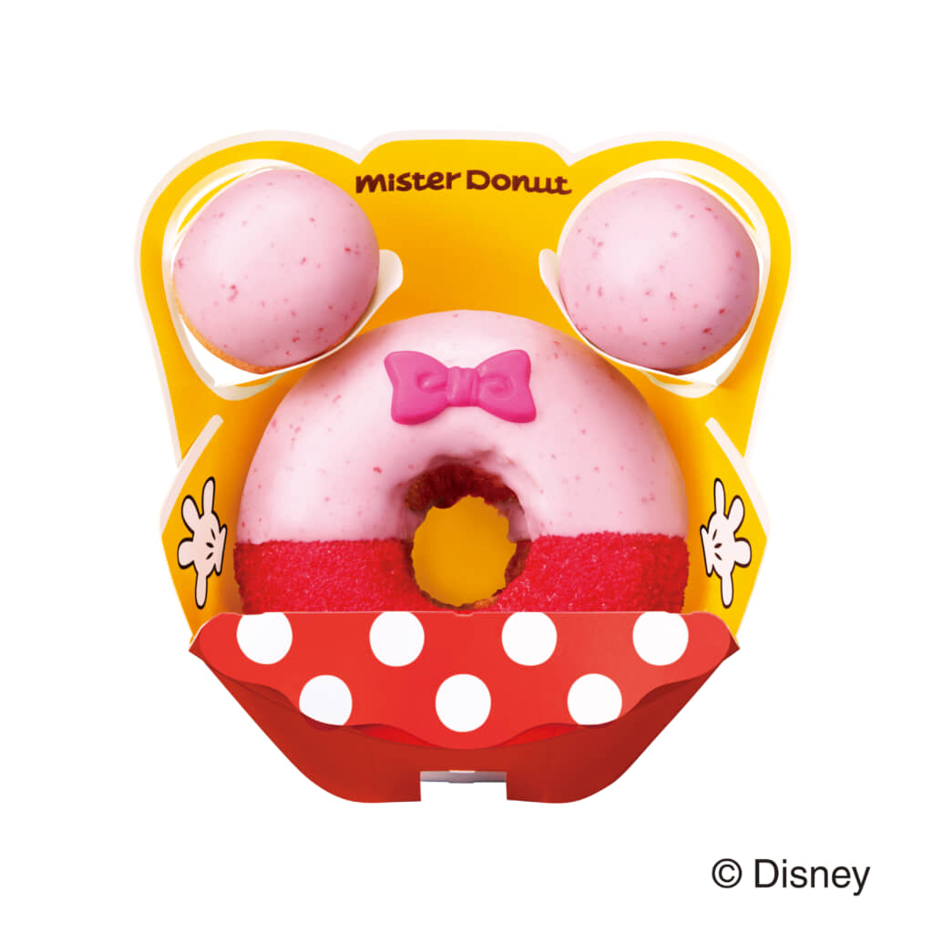 ミニーモチーフの「ふわふわシューストロベリーリング<ミニーマウス>」はストロベリーチョコとりんごシュガーでミニーマウスを表現。ピンク色のリボントッピングがアクセントになっています。