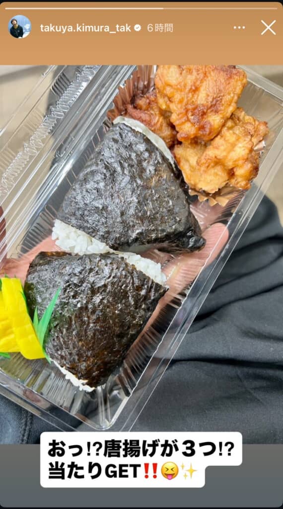 木村さんは、フタを開けたばかりのお弁当の写真をInstagramストーリーズにアップ。写真にはたくあんとおにぎり2つ、奥に詰められた唐揚げが3つ写っています。木村さんはお弁当の内容について、テロップで「おっ!? 唐揚げが3つ!? 当たりGET!!」と絵文字を交えてテンション高めに報告しました。